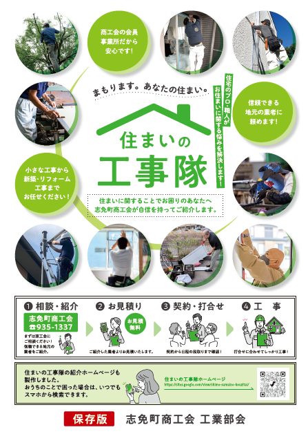 例年好評の「住まいの工事隊」を今年度も作成しました。 志免町の信頼と実績の31社が掲載されています。 住まいに関することで、お困りの方、ぜひご活用ください。